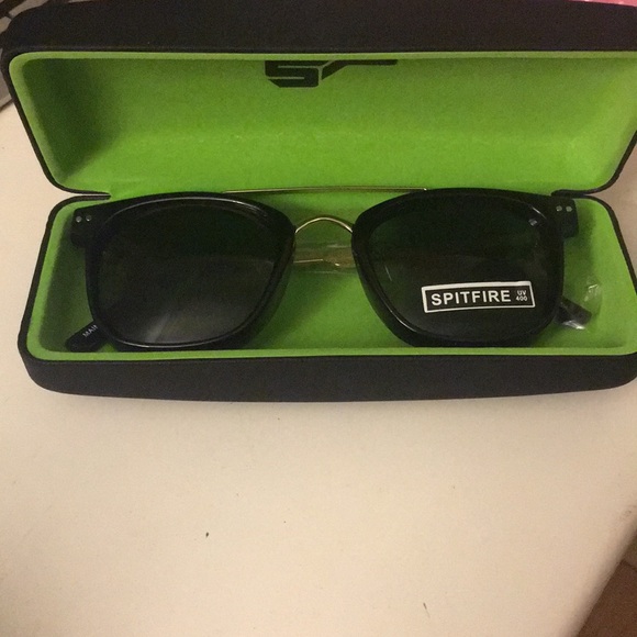 Black lensed spitfire sunglasses with gold details. Never been worn! Comes with case.