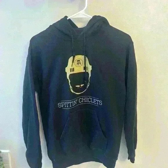 This is a Spittin Chiclets black hoodie, adult size small. This is unisex. This is well loved, but there are no stains or rips in this hoodie. Tons of life left