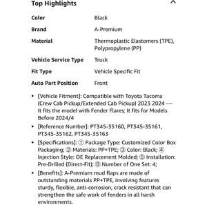 Compatible with Toyota Tacoma (Crew Cab Pickup/Extended Cab Pickup) 2023 2024 --- It fits the model with Fender Flares; It fits for Models Before 2024/4