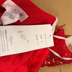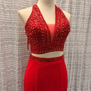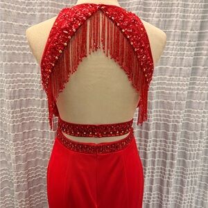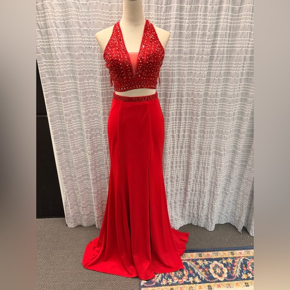 Dazzle in this stunning red backless gown by Splash. Features a halter neckline with exquisite embellishments.