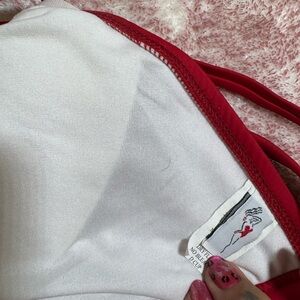 Stylish red bikini set by Splash. Features a bandeau top and cheeky bottoms. Perfect for beach days.