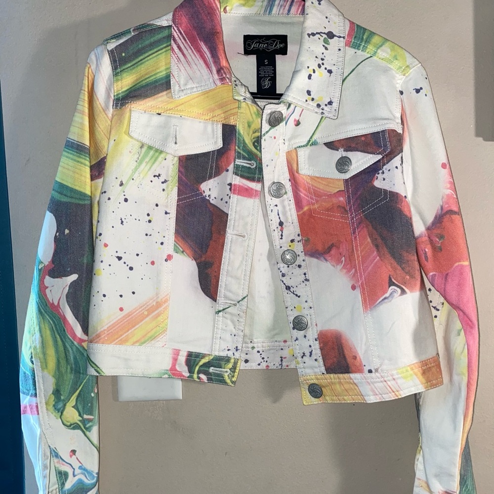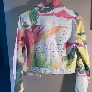 Long sleeve colorful splatter look cropped jacked, kind of a jean jacket vibe. It’s super cute and a bit stretchy. Only used once.