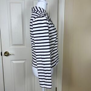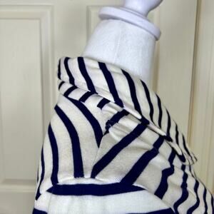 Super cute asymmetrical white and navy striped knit moto jacket. Fitted with large collar.