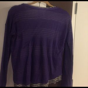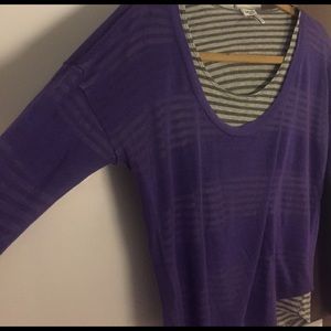 Purple scoop outside and gray strip inside! 50 per cent Poly and 50 per cent rayon. Very comfortable.