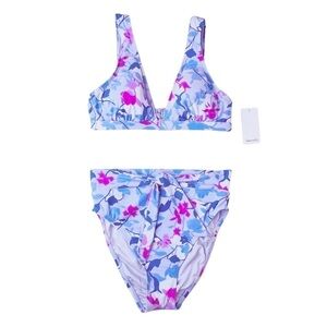 Splendid Bikini Floral Medium Triangle Top High Rise Bottoms Blue Pink New NWT