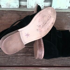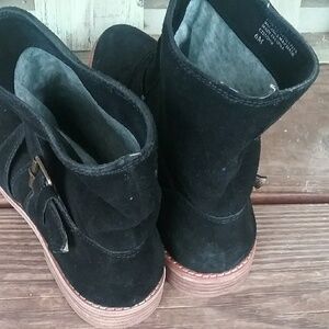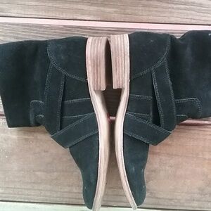 These booties are pre owned but in excellent condition. They are black suede with crisscross strap around the body of the boot.
