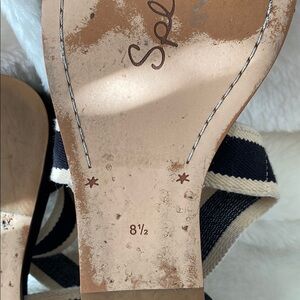 These Splendid sandals showcase a sleek asymmetrical design with a blend of black and tan hues. The stretchy straps ensure a comfortable fit, while the slight heel adds a touch of elegance, making them ideal for versatile wear.