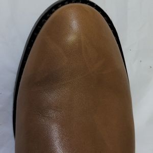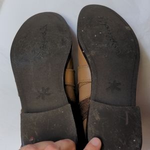 Leather upper with sweater material. Good used condition. See photos for normal scuffing