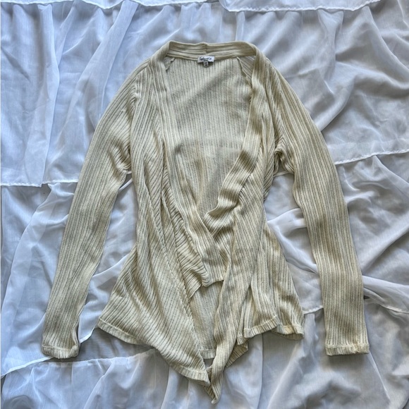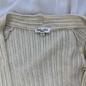 Splendid open front light weight beige shrug/cardigan in a size small. Perfect to dress up any outfit but light enough for a beach coverup. Note that this sweater has straining towards the bottom.