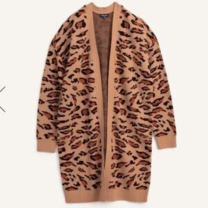 Open front, animal print, cheetah print, thigh length, long sleeves, ribbed stretch cuff and hem, knit