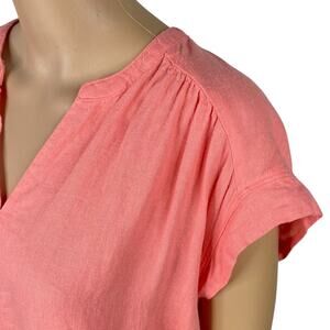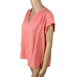 This top by Splendid is a pull on style with an over-sized fit and short cap sleeves. It has gathered detail on the shoulders and small slits up the sides. Fabric is a soft linen and viscose blend and is a pastel coral pink color. Light wear, top is in great condition! No notable flaws.