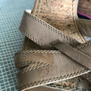 Splendid nude cork wedges, size 9. 4" cork heel with rubber bottom. Leather straps that clasp at heel. Some minor stains and lining cracking on inner straps - all pictured and barely noticeable.