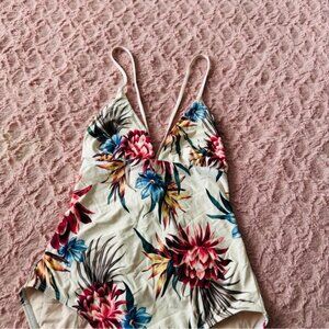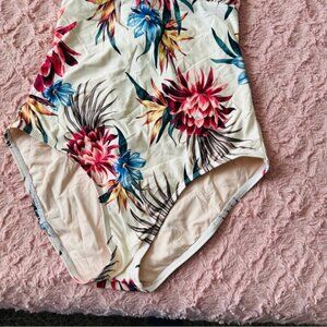 Stylish one-piece swimsuit with a vibrant floral design. Features a lace-up back and adjustable straps. Perfect for beach days.