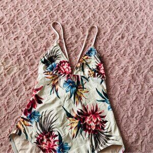 Stylish one-piece swimsuit with a vibrant floral design. Features a lace-up back and adjustable straps. Perfect for beach days.