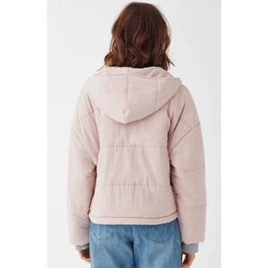Bombed jacket made from nylon that has been quilted for a puffed effect. Features a adjustable drawstring hood and snap closure.