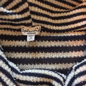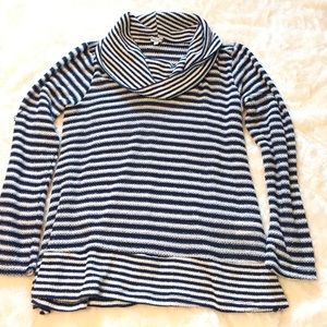 Splendid from Anthropologie. Cozy Knit sweater, variegated stripes, relaxed fit, cowl neckline, long sleeves, side slit detail, hen hangs longer at back, lightweight and drapes easily.