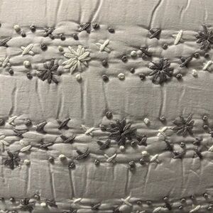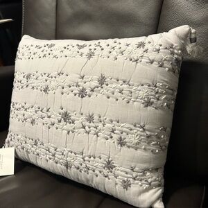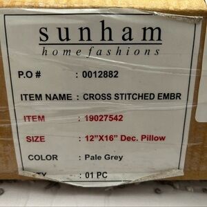 Great decorative pillow which will add a great accent to your home. The color is a pale grey and it is embroidered with cross stitching. The company name on the box is sunham home fashions. Never used