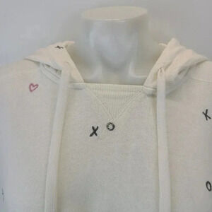 Splendid Embroidered Heart XO Snowland Ivory Hoodie Sweatshirt Oversized Small. Soft knit cotton polyester blend. Ivory with gray and pink embroidered hearts and XO. Hooded round neckline with drawstrings. Dropped shoulder. Long sleeve. Ribbed cuff. Pullover. Oversized, wide boxy fit. Cropped length. 60% cotton, 40% polyester. New with tags. Cozy casual style. Great for Valentine's Day.