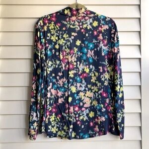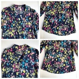 Splendid Floral Ikat Print Top in navy blue with multicolor color print. Long sleeve blouse with v-neckline and front pockets. Button cuff sleeves that can be worn down or rolled up and buttoned. Lightweight 100% rayon. Worn once and in excellent condition with no visible signs of wear. Approx. 26” long and 19” across from armpit to armpit.