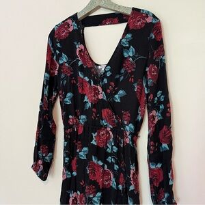 Features: dark rose print floral, maxi dress with deep v neckline and slit, cinched waist, long sleeves.