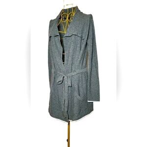 Cozy gray cardigan with a tie belt. Features a draped collar and long sleeves. Perfect for layering.