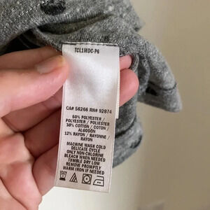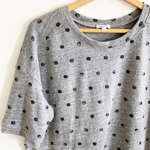 Oversized short sleeve gray top with black polka dot print. Thicker knit. Shorter length. Soft with great stretch. Made with polyester, cotton, and rayon. No flaws