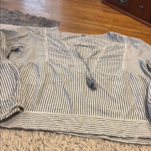 Chic top with gray and white stripes. Features a stylish design. Good condition