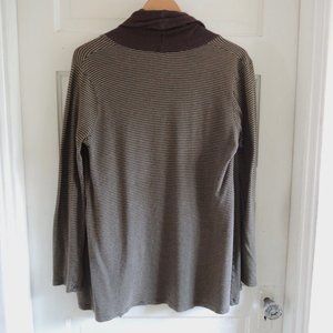 Splendid green & brown striped open cardigan, size Medium. Soft knit cardigan is a perfect light layer in shoulder seasons. Woodsy green & brown narrow stripe, long sleeves slightly widened at cuff , solid brown at open front, collar creates ruched effect at back of neck. Fuzzy and soft, 100% cotton. Belt loops but no belt (could be cut off), otherwise good gently pre-owned condition.