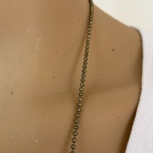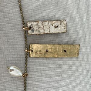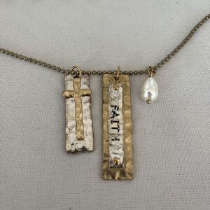 Add a touch of elegance and inspiration to your outfit with this stunning necklace from Faith. The pendant features a beautiful rectangle-shaped cross with a simulated pearl at the center, surrounded by the words of faith and awareness. The pendant hangs from a brass tone ball chain with a secure ball closure. It measures just over 29 inches long. Perfect to wear on Sunday, to a Christening, Confirmation/Communion, or any occasion, this necklace is crafted from mixed metals that complement any outfit. With its intricate design and meaningful message, this necklace is a must-have for anyone who values faith and inspiration. It is in fair condition, with tags, and a lot of shelf wear like scuffing and worn plating.