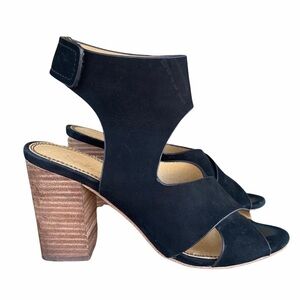 Splendid Jerry Black Open Toe Ankle Cuff Chunky Heel Sandal-Women’s Size 8. Leather Suede upper. Ankle cuff with hook and loop closure. Criss cross straps across toes. Chonky stacked block heel. So chic and cute! Perfect for jeans or a LBD! Great preowned condition with some minor signs of wear on the leather and interior.