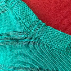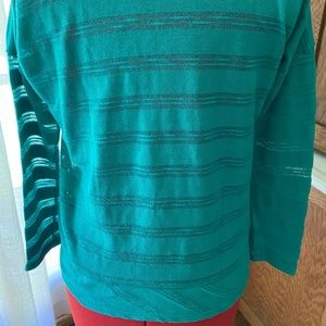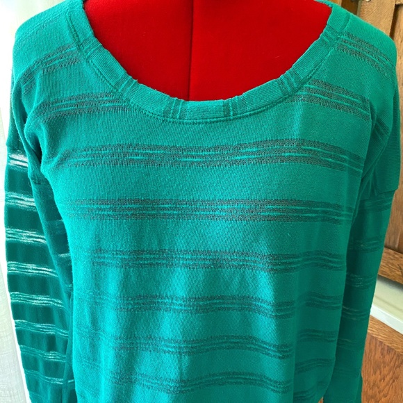 Sheer knit long-sleeved pullover in a striped pattern with bias-patterned hem and neckline. Beautiful kelly green color, lightly worn.