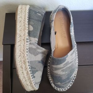 Splendid Laney camo espadrille slip ons size 6.5. Almond toe, slip on, 1.25" espadrille heel, canvas upper, unlined, rubber sole.