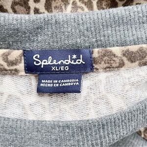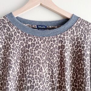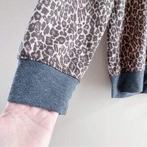 Leopard Print Sweater by Splendid, featuring contrasting grey trim, crew neckline, long banded sleeves, relaxed fit, pullover style, soft and cozy fabric with stretch. Color: tan & brown leopard print with grey trim.