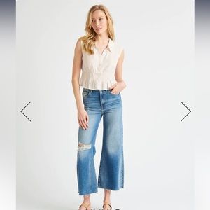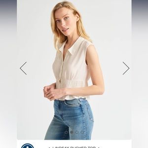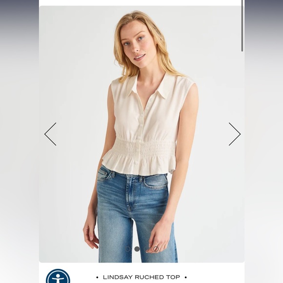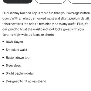 Our Lindsay Ruched Top is more fun than your average button down. With an elastic smocked waist and slight peplum detail, this sleeveless top adds a feminine vibe to any outfit. Plus, it's designed to hit at the waistband so it looks great with your favorite high-waisted jeans or shorts.