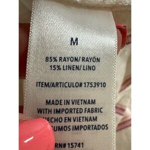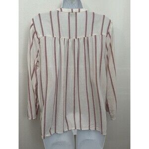 This Splendid blouse in size Medium features a striped pattern in white and pink, with a relaxed fit and a V-neckline. The 3/4 sleeves and casual sleeve type give it a boho and peasant style, perfect for a beachy or coastal look. Made from a linen blend fabric with a rayon material, it is machine washable and suitable for all seasons, making it ideal for travel or casual wear during summer, fall, or spring. Blouse is in excellent preowned condition worn only once or twice with no obvious flaws stains or holes. Freshly laundered, sanitized, steamed and bagged. Measurements are in pictures. I appreciate your business and strive for five star rating. Please feel free to message me with questions.