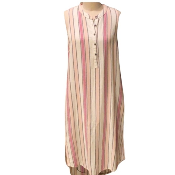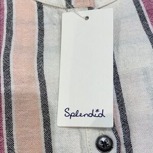 Splendid Sleeveless button front dress NEW WITH TAGS Linen blend..Hi-low hem Tan/pink/peach stripe Size medium Approx 20.5 chest front length 43” The back is 4 inches long. Did not come with Belt.