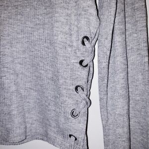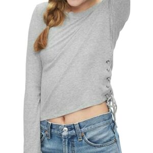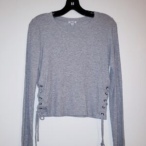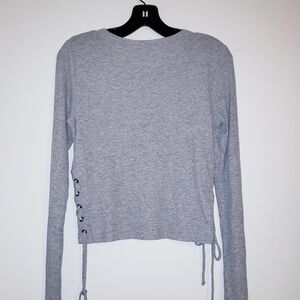 Item is in Great Used Condition. Grey Long Sleeve Top with Crew Neck and Side Tie-Up Detail.