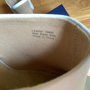 A casual white leather slip on mule with a stacked block heel that adds stability while walking.