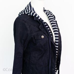 Splendid Navy Hooded Denim Jacket Striped zip-up M, Casual Coastal Preppy