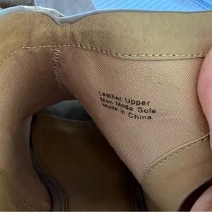 A stacked heel lifts a soft peep toe sandal that’s all about clever design - a back strap conceals a buckle, while the kid suede upper lends sleek lines. Block heel. Peep toe. 3 1/4” heel. EUC.