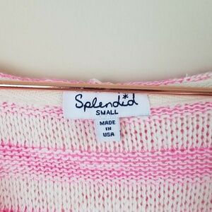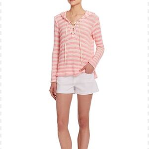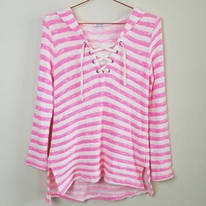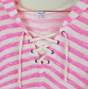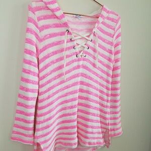 Splendid Ohana knit hooded sweater. Pink and white striped. Lace-up neckline. 53% cotton, 27% rayon, 16% polyester, 4% spandex. Size small.