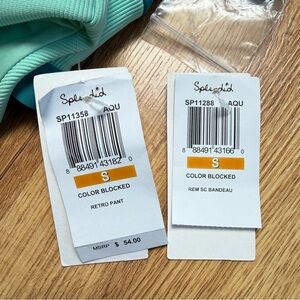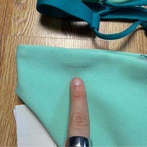 Super flattering ribbed texture, aqua blue + teal color block, cutout bandeau top (comes with straps) , low rise hipster bottoms