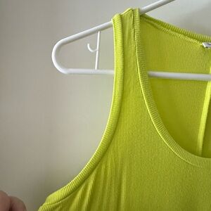 Splendid racerback tank top, neon yellow green, super soft stretchy ribbed material, crew neck, longer length with rounded hem, slightly longer in back, seamed detail down back, rayon/spandex blend, relaxed fit, in very good pre-owned condition. Women's Size Medium