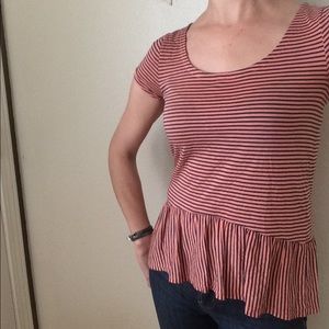 Adorable and so soft this tee has soft salmon and navy blue stripes and a high low drop waist ruffle.