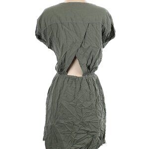 Short sleeve, v-neckline, shirtdress, solid, ruched detail, button, shirring, embossed, eyelet, frayed edges, pintuck embellishment, seam, whiskering, drawstring, distressed, gray, green short