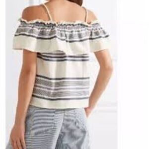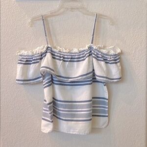 Chic off-shoulder top with blue and white stripes. Ideal for casual outings.