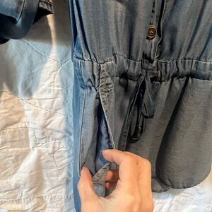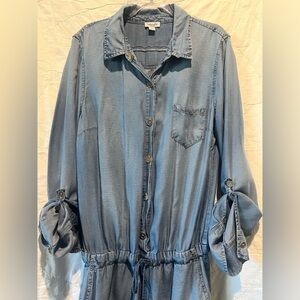 SPLENDID long sleeve denim romper/ jumper. Elastic waist has front tie. 2 front shorts pockets, 1 chest slip pocket, button down front, collar, button cuff sleeves. Soft and light weight.