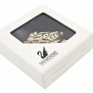 This stunning designer brooch by SWAROVSKI showcases a striking figural zebra head, expertly crafted from a gold-plated setting and encrusted with dazzling SWAROVSKI crystals. The zebra's distinctive black enameling beautifully contrasts with the shimmering crystals, enhancing its elegant allure and adding depth to its intricate design. A single green crystal serves as the eye, lending a captivating sparkle that draws the gaze. The back of the brooch is adorned with exquisite green guilloche enameling, providing a luxurious finish that complements the front's opulence. Marked with the iconic SWAROVSKI swan logo and in excellent condition, this exceptional piece measures approximately 1 3/4" by 1 7/8", making it a perfect statement accessory for any occasion.