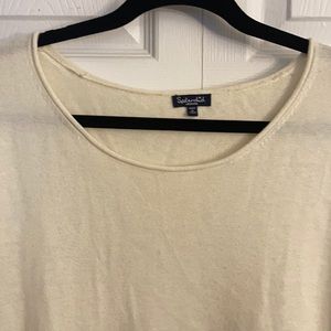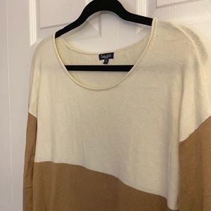 Very soft casual sweater. Ivory and tan with rolled hem. Gently worn with very slight pilling (a quick once over with a sweater shaver should take care of it). Great with jeans or leggings, and super comfy for fall!
