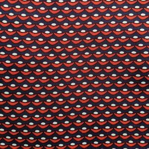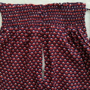 Smocked halter neck. Spaghetti straps. Sleeveless. All-over print in red, white, and navy blue. Two hook and eye closure and keyhole opening at front neckline. Swing style. Lightweight material.